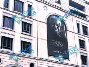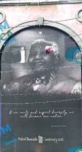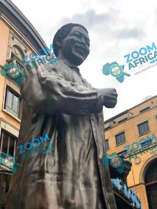 ويقع تمثال مانديلا في قلب الساحة الخارجية (البياتزا)، وهو نصب تذكاري مهيب صممه النحاتان كوبوس هاتينغ وجاكوب مابونيان.